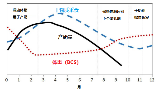 奶牛體況評分BCS這一個指標可以同時反映奶牛的產奶量、體重和干物質采食,其關系見下圖。